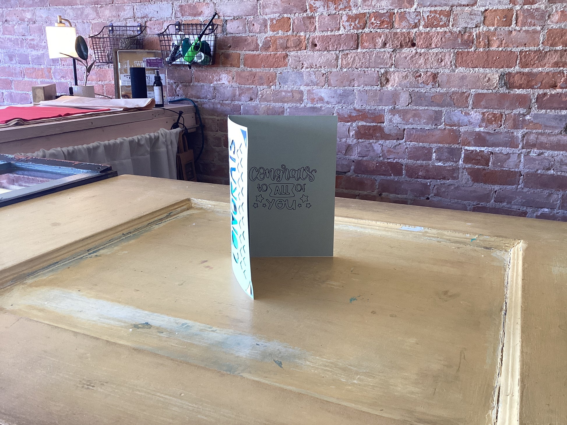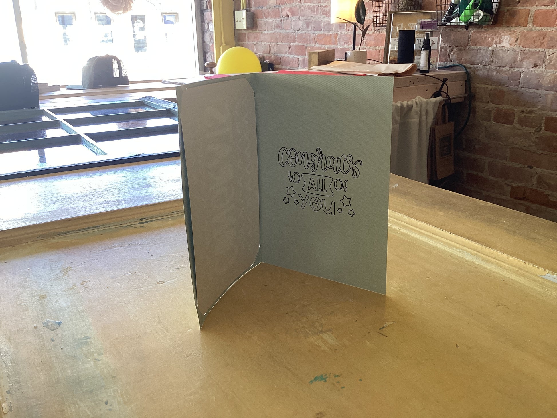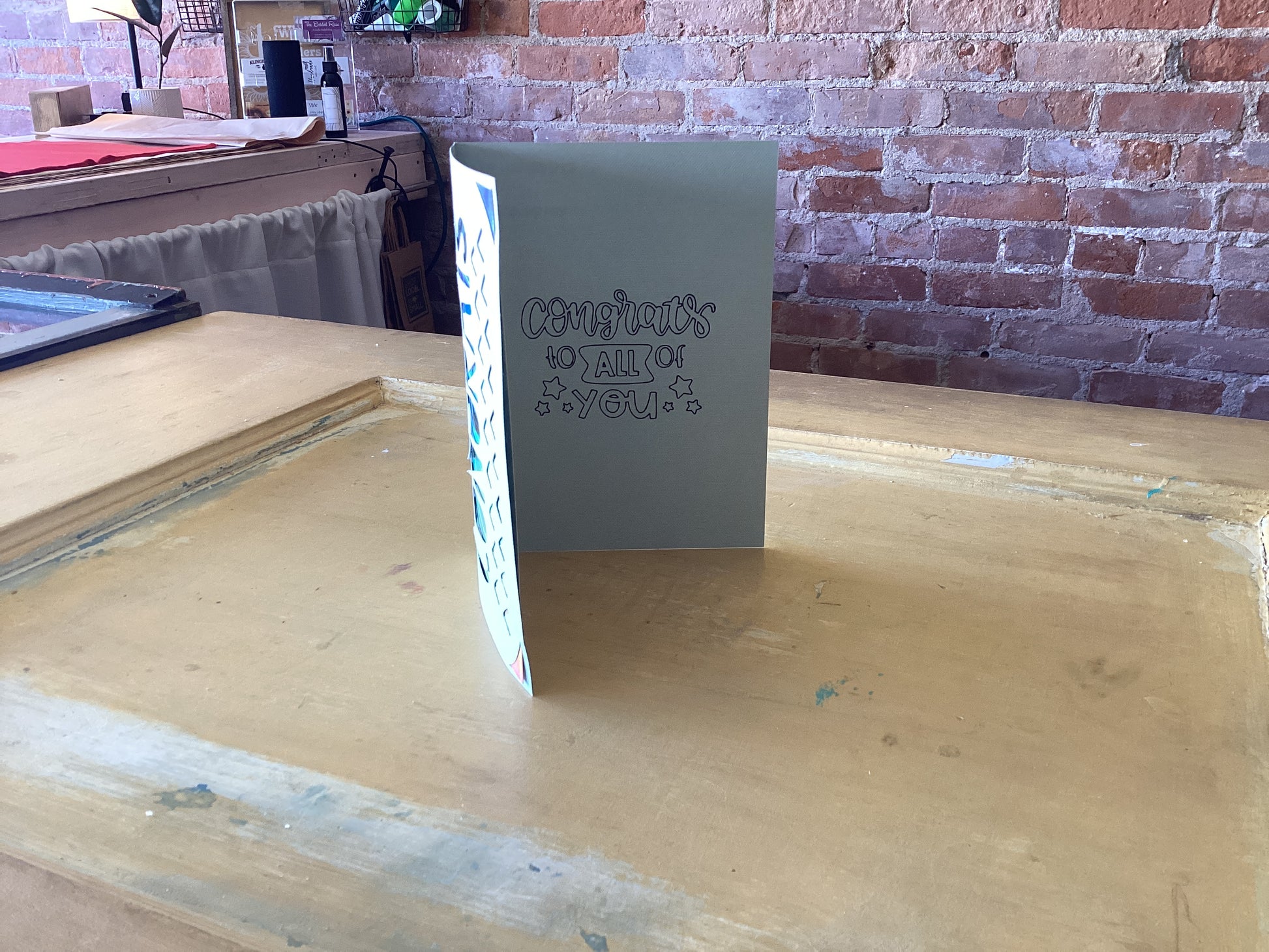 Celebrate their accomplishments with our handmade Congrats Card! Made in Michigan, this unique card features a vibrant "congrats" cut out of cardstock, with a holographic insert behind it. The inside of the card reads "congratulations" to make their achievement feel even more special. Show them how proud you are with this one-of-a-kind card.
