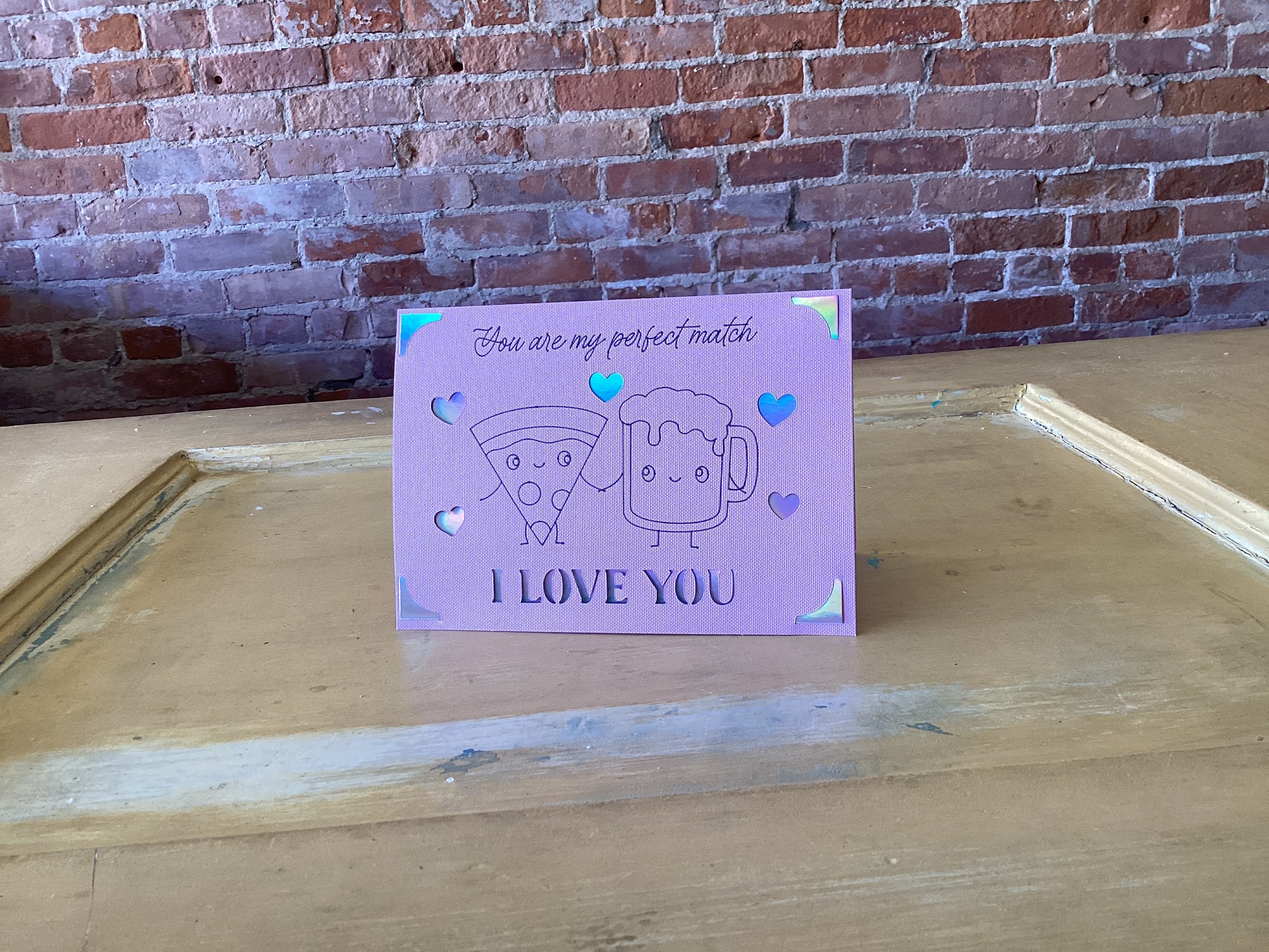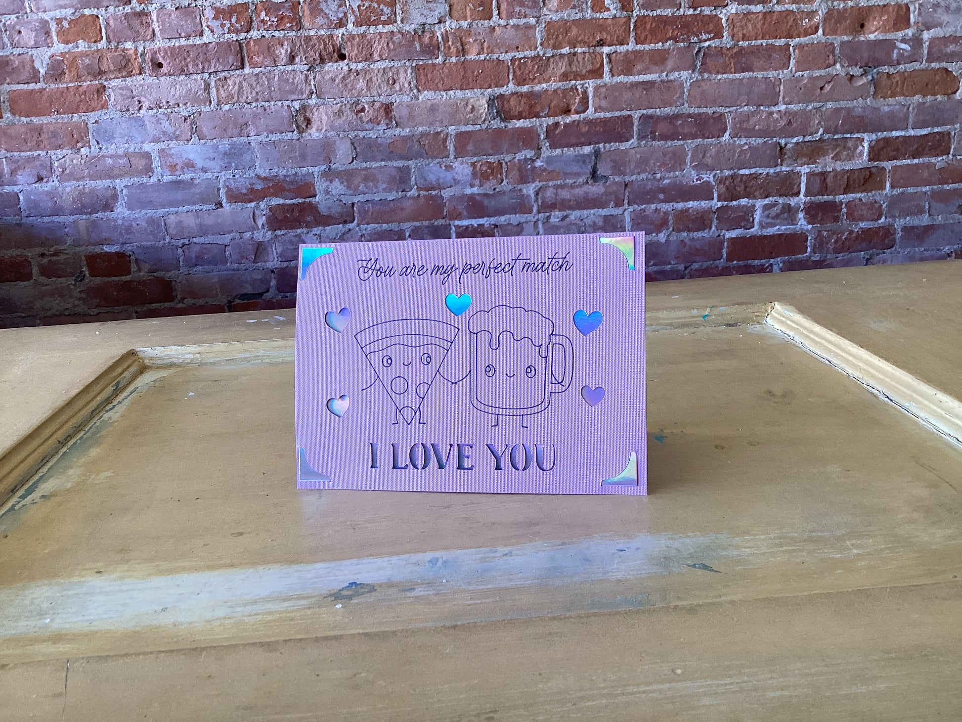 Celebrate your love with our handmade "I Love You - You Are My Perfect Match" card. Perfect for any occasion - Valentine's Day, anniversary, or just because. Featuring a heartwarming image of pizza and beer holding hands, this card expresses your love in a fun and unique way. Show your special someone how much they mean to you with our charming card.