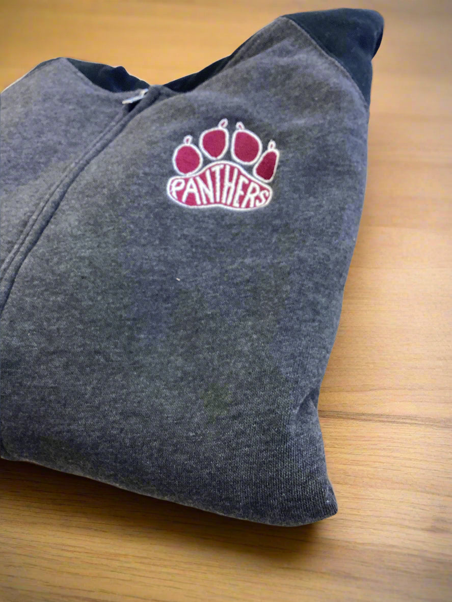 Feel fierce and stylish with our Panther Paw Zip Up Youth Hooded Sweatshirt. Featuring carbon black and gray colors with an embroidered maroon and white panther paw, this hooded sweater will show off your Panther pride. Perfect for youth sizes, this sweatshirt is both comfortable and eye-catching.