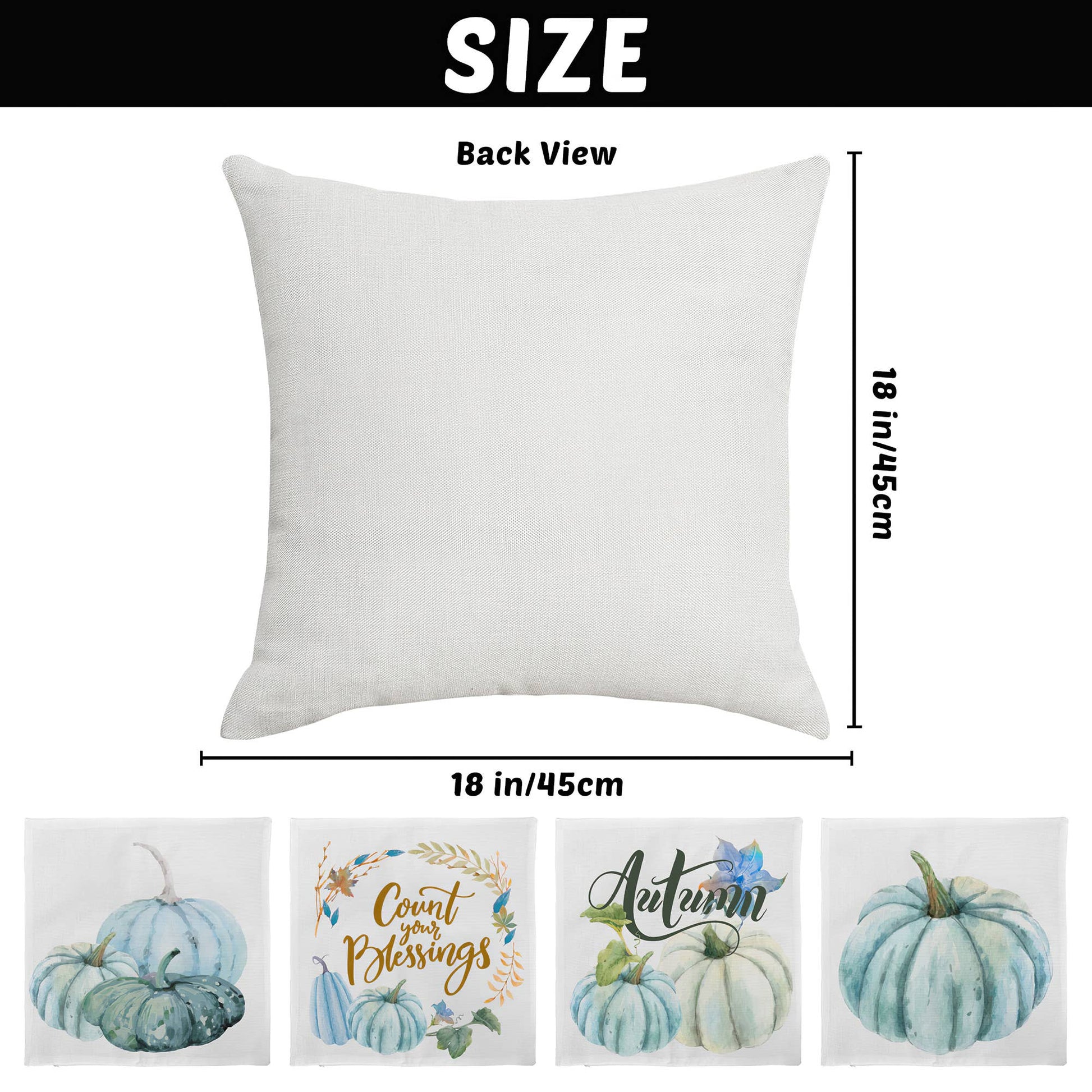 Transform your home's aesthetic with this Thanksgiving Pillow Cover Set of 4, measuring 18x18 inches to fit standard throw pillows. Exude warmth and charm to your indoor space with these fall designs. Constructed from linen fabric, these covers are durable and easy to take on/off, and the smooth surface allows for simple washing when needed. Featuring a single-side watercolor painting and blue pumpkin décor in 4 styles, these covers boast an invisible zipper for a secure fit. Create a beautiful space for the Thanksgiving season in your living room, terrace, or patio.
