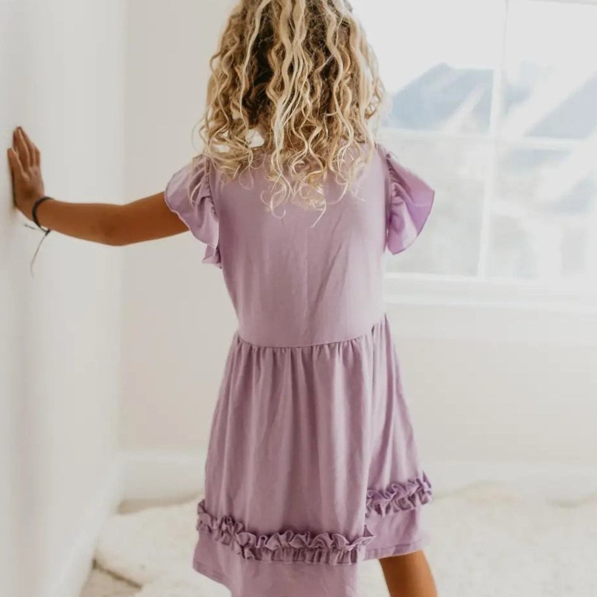 Vestido de Pascua con botones y volantes en color lavanda pastel