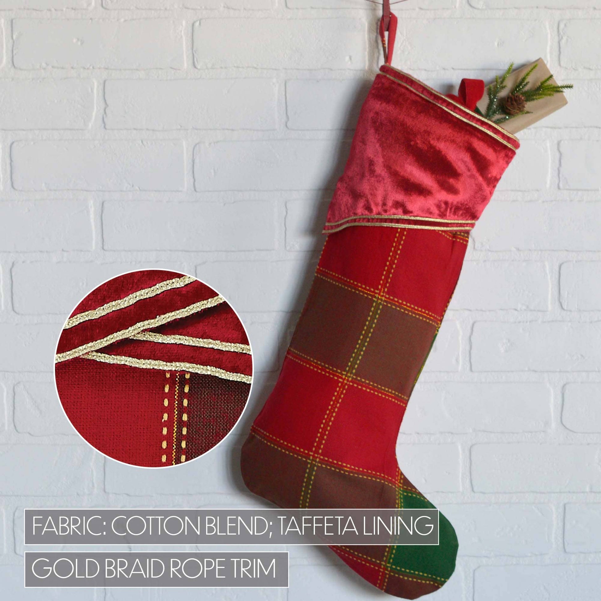 This holiday season, get into the spirit with this elegant Tristan Stocking in country red and green plaid and antique gold. This 11x20" Christmas stocking hangs easily from a fabric loop. Made to last, the Tristan stocking is the perfect farmhouse decor item for your holiday hearth. Includes: 1 x Stocking; Care Instructions: Hand Wash, Lay Flat to Dry Material: 80% Cotton / 20% Viscose Face, Polyester Taffeta Lining The Tristan stocking brings a touch of warmth and festive charm to your home. Its sturdy, timeless design will make it your favorite holiday decor piece for years to come. Get ready to embrace the holiday spirit with the Tristan stocking!