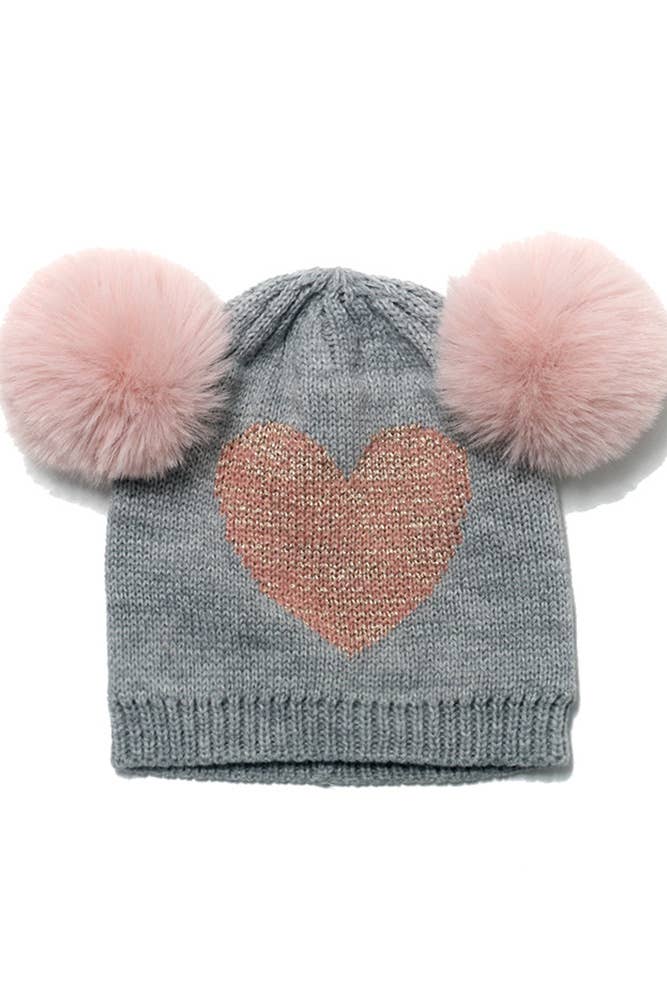 ¡Mantén a tu pequeño cómodo y súper lindo con este gorro de pelo tejido con corazones! Está hecho de un material gris suave, con un adorable corazón rosa en el centro y orejas peludas con pompones. ¡Tan cálido y divertido que seguramente marcará tendencia!