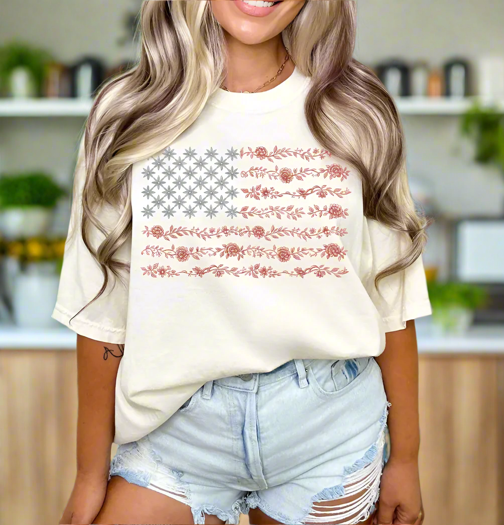 Celebrate patriotism with this American Flag Chinoiserie Floral T-Shirt, thoughtfully crafted on a soft triblend Bella Canvas fabric. Designed for breathability and comfort, it’s perfect for Fourth of July festivities and comfortable enough to wear all year round. Handmade with care this shirt blends classic patriotic style with a unique floral twist.