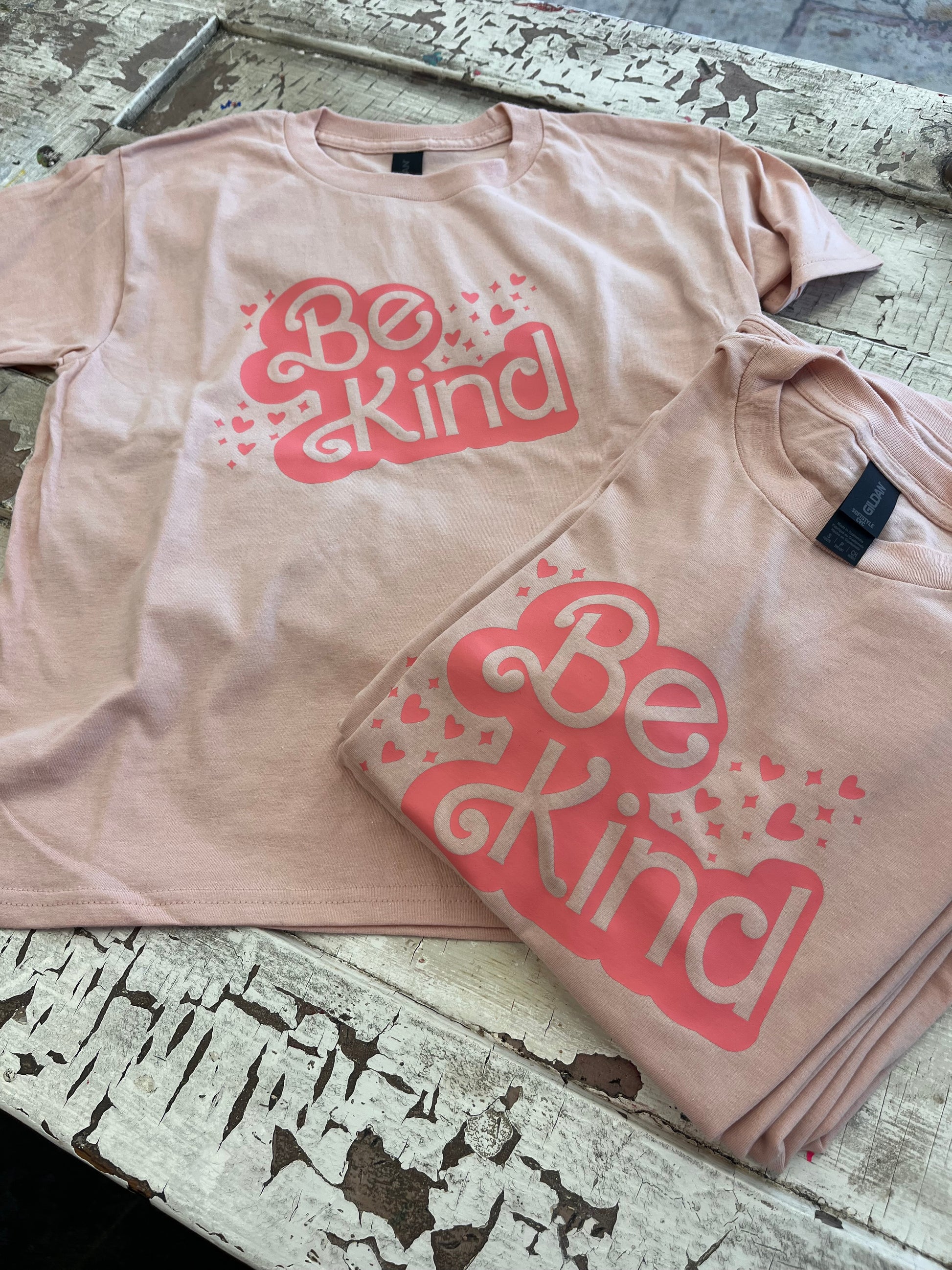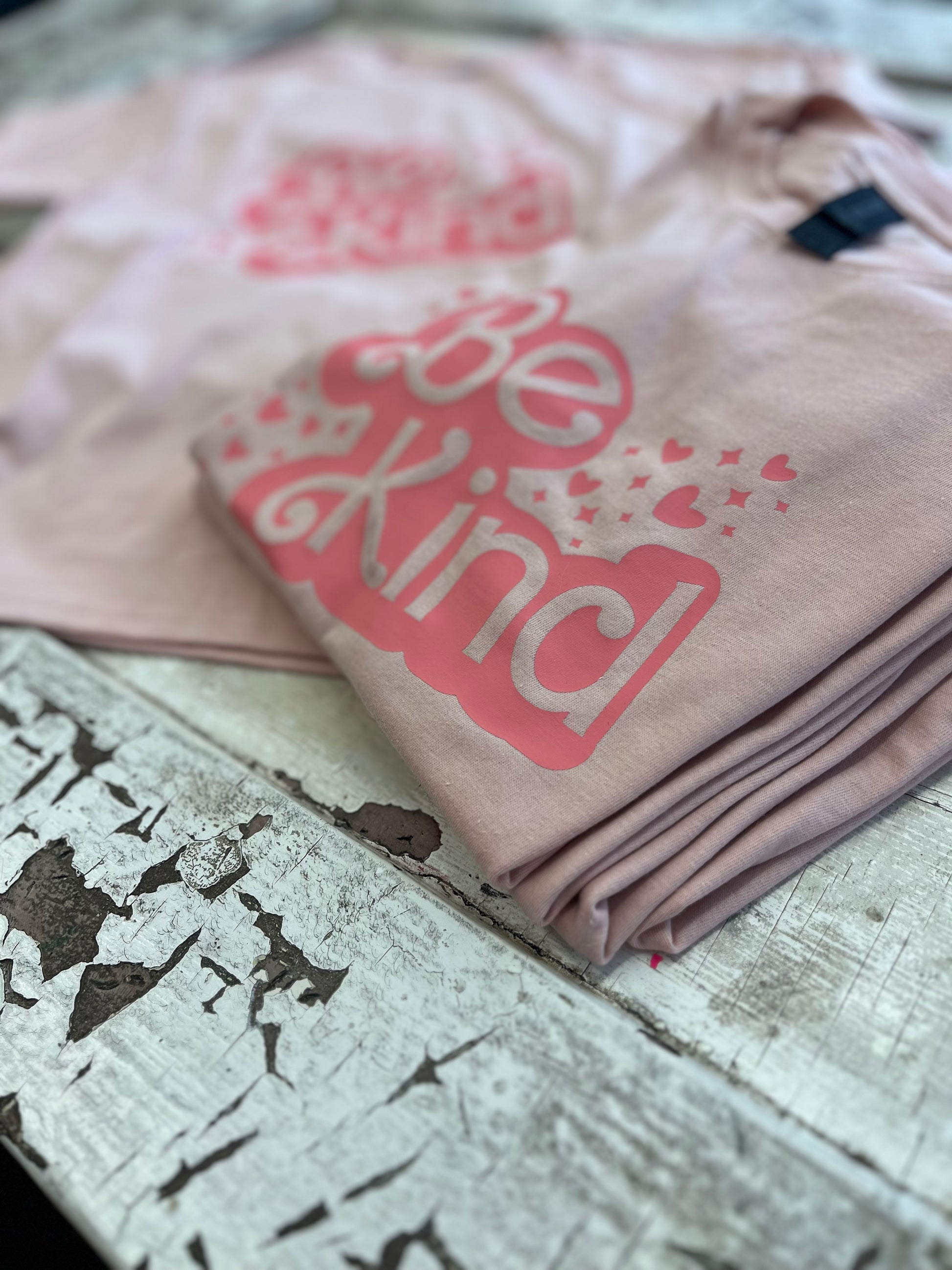 Be kind, and look trendy doing it, with our soft dusty rose youth t-shirt. Adorned with vinyl lettering in a cute barbie font, this shirt serves as a gentle reminder to spread love and positivity. Don't sacrifice comfort for style - this shirt has both covered with its super soft material. Available in youth sizes.