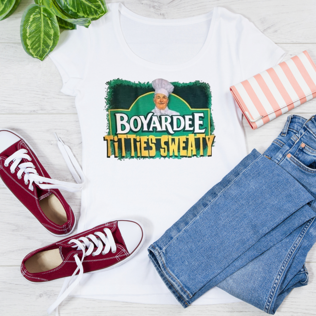 Stay cool, dry, and stylish in the Boyardee Titties Sweaty T-shirt! Made with a soft, comfortable fabric, this tee is the perfect way to keep your swag level on '10' when temperatures start to climb. Say goodbye to sweat stains; it's time to get your 'titties' on! Leave the sweat stains behind and keep your cool with the Boyardee Titties Sweaty T-shirt. Made with soft, comfortable fabric, this tee will keep you stylish and sweat-free as you rock your 'titties'. Say hello to effortless comfort and confidence, even on the hottest days!