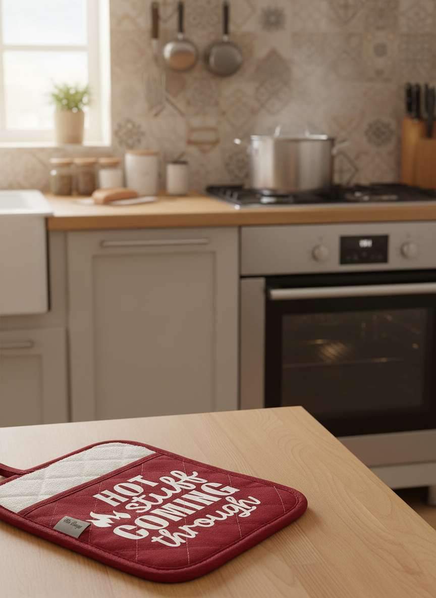 Introducing the Hot Stuff Coming Through kitchen pot holder. Crafted with heat resistant silicone and a non-slip grip, this 9.8"L x 6.9"W holder will keep your hands safe while baking and cooking. It's fun "Hot Stuff Coming Through" saying will add some humor to your kitchen routine.