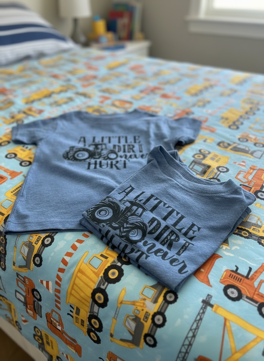 Get your little one ready for fun on the farm with our Little Dirt Never Hurt shirt! This light blue toddler size shirt features a cute tractor image and the saying 'A little dirt never hurt'. Made from soft Bella + Canvas fabric, your child won't want to take it off!